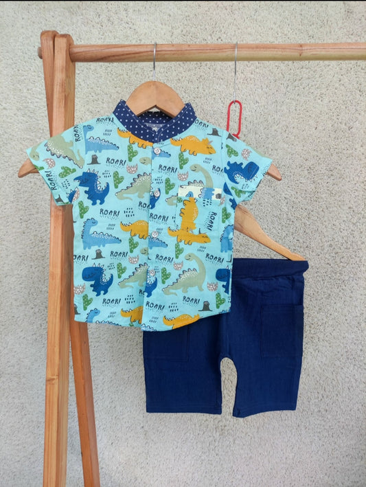 Funky Cotton Shirt with Shorts Set |Aqua Dino Valley -FS1006
