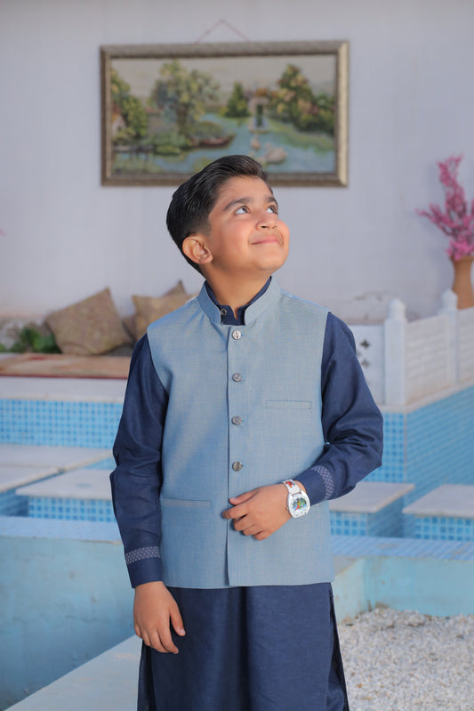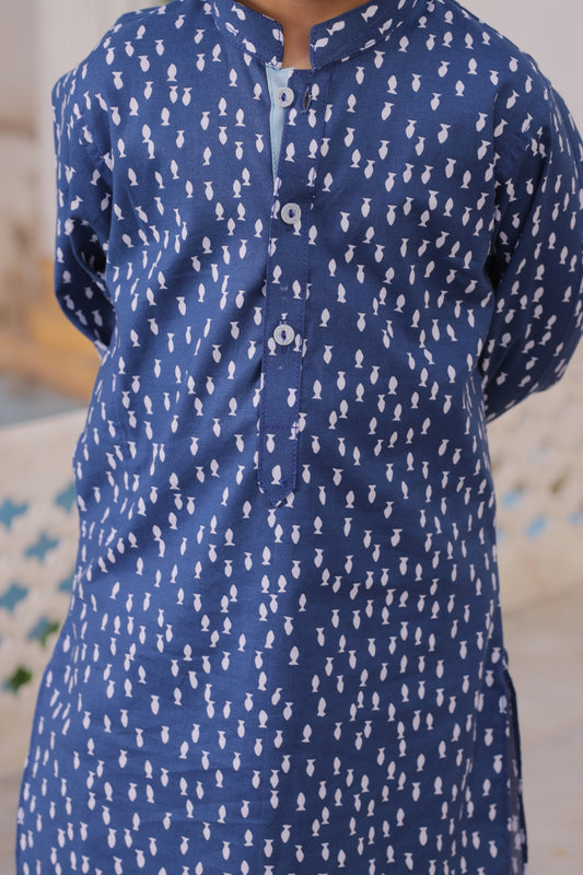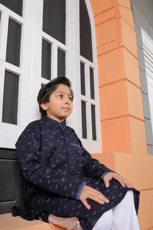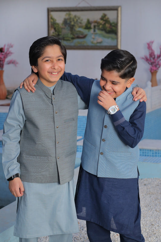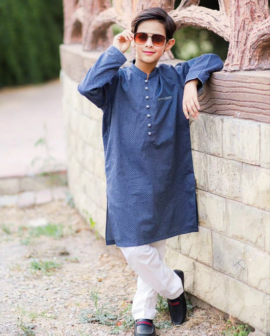 Blue n Gray Self Print with Loops Kurta Trouser -Father Son Duos