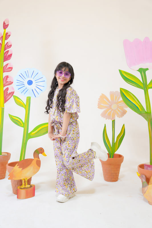 Purple with Yellow Flowers crop-top with Bell Bottom -CT146